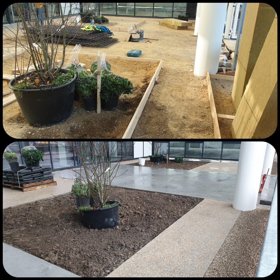 À Tremblay-en-France, nous avons transformé un accès existant en combinant deux techniques de béton décoratif. Le contraste entre le béton désactivé pour les zones de circulation et le béton poncé pour les finitions offre un rendu visuel architectural et haut de gamme.
