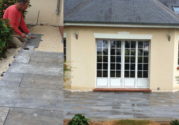 Ce projet atypique réalisé à Rouen utilise des dalles à l'aspect bois noir, combinant l'esthétique du bois avec la résistance du grès cérame. Parfait pour une terrasse contemporaine sans entretien.