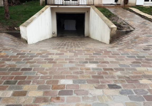 Rénovation complète d'une allée d'accès à Courcelles-sur-Viosne. Nous avons transformé une surface existante en une allée de prestige utilisant des matériaux nobles, garantissant une résistance au passage de véhicules tout en soignant l'esthétique.