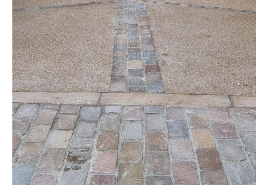 Béton désactivé (ton pierre roulé) & caniveau pavé grès