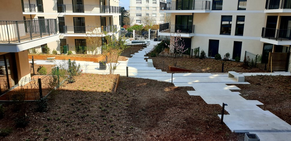 Béton balayé blanc & chaînettes en pavés